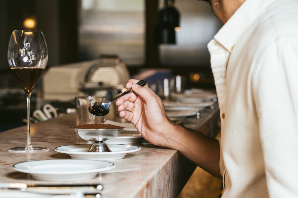 Explorando um pouco o menu, começamos com pão de fermentação natural, azeite e azeitonas. Depois, saboreamos uma boa charcutaria ibérica. Nos pratos, o discurso torna-se mais intenso. As molejas de borrego alentejano são um desses exemplos, um produto intenso a pedir um copo de vinho e tempo à mesa. A costeleta de borrego ou a presa de porco alentejano reforçam também esse lado mais telúrico da carta, onde a qualidade da matéria-prima fala mais alto do que a técnica.